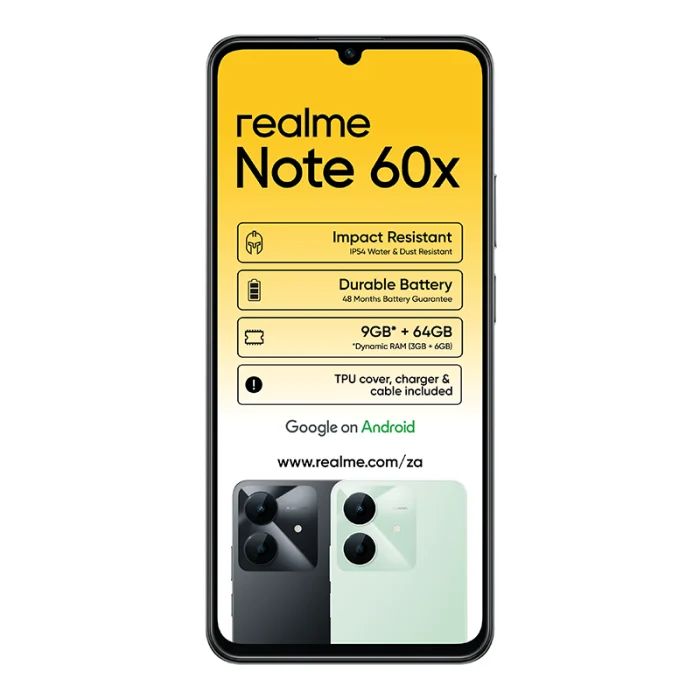 Introducing the realme Note 60x 64GB—a smartphone that masterfully combines durability, performance, and style to meet the demands of modern users.